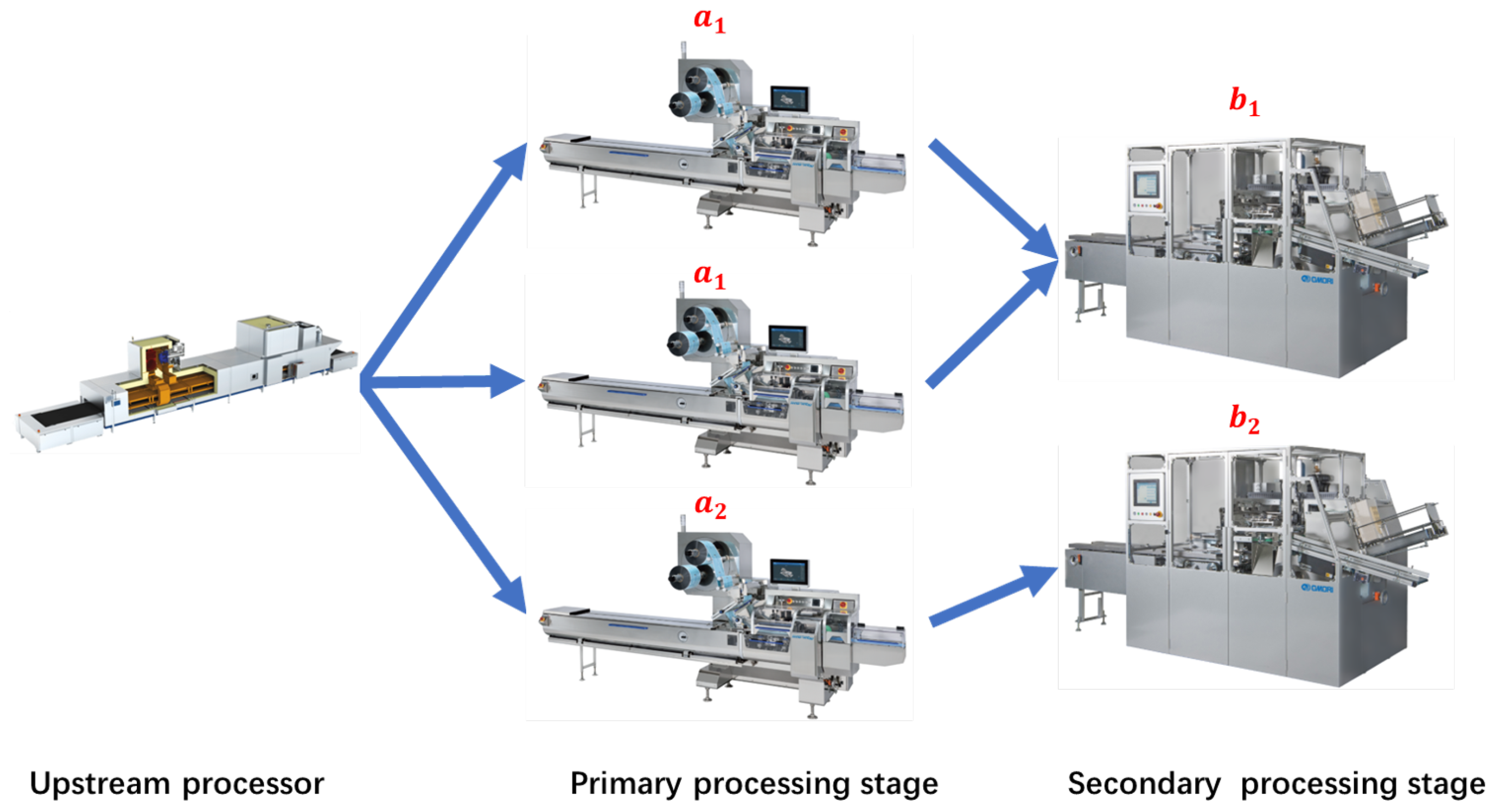 The flow shop, as one of the most common production modes in modern manufacturing, has been extensively studied in the academic field [1]. Classical flow shop models, such as hybrid flow shops, flexible flow shops, and permutation flow shops, mostly focus on discrete job processing and rarely explore processing modes with continuous-flow characteristics [2,3]. In many modern production systems, however, the material moves continuously through several processing stages and is subject to strict no-wait constraints between them. A representative example of such a production system is the biscuit baking and packaging line. After the molding stage, the biscuits move at a constant speed through an oven of a certain length, completing the baking process during transit, and are then packed and boxed in two subsequent packaging stages. The machines at each stage can be regarded as a set of parallel machines and can process the biscuits under different processing specifications according to order requirements.