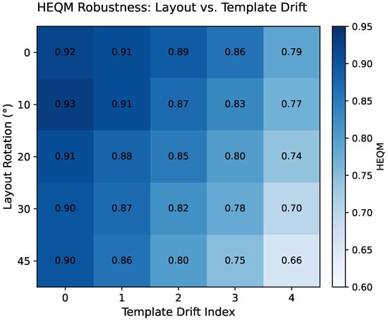 Figure 12 represents the Doc2Ledger-LLM system that has HEQM scores that are greater than 0.85 in most of the tested conditions. Performance only drops at a slow rate, even when layouts have been rotated or templates have been distorted considerably. This represents the power of multimodal feature fusion in combination with deterministic validation on our distributed architecture.