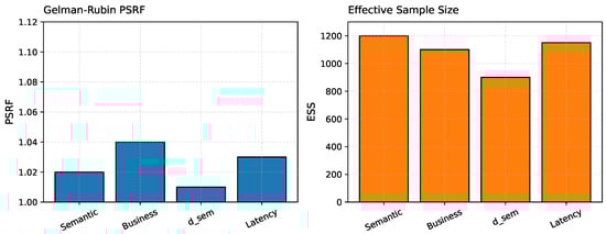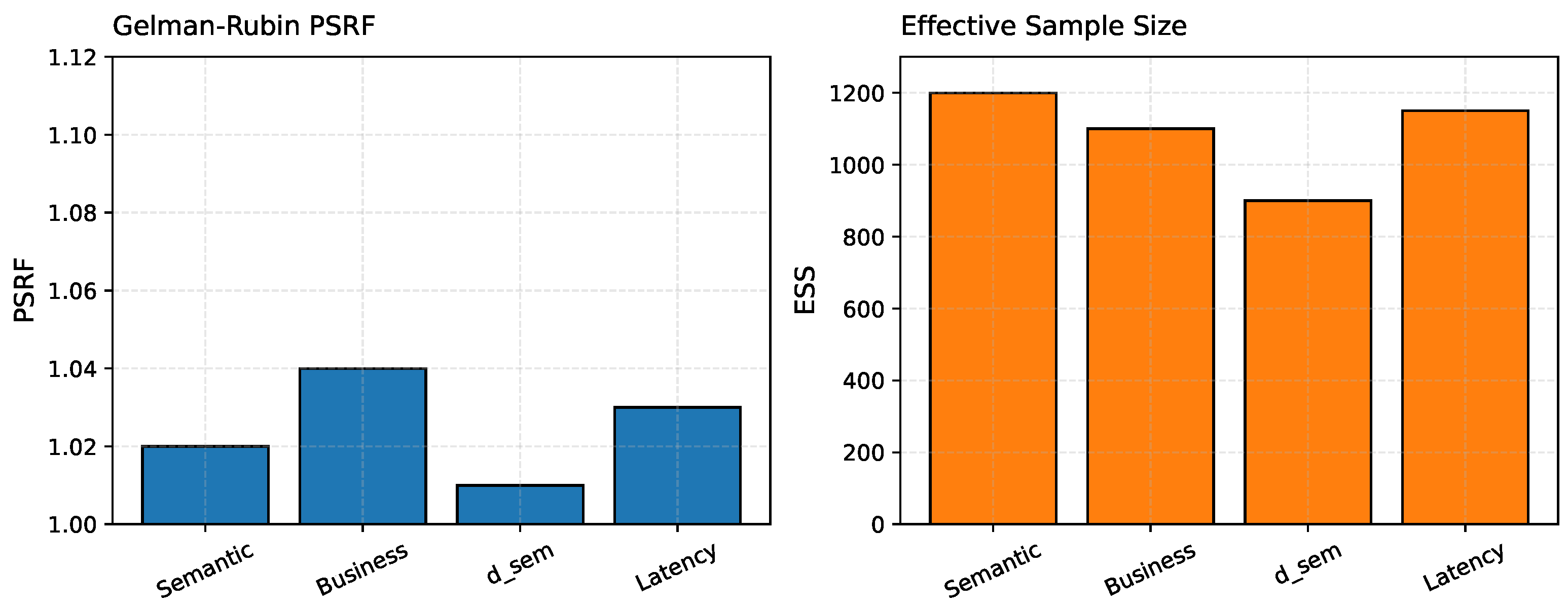 Figure 14 complements this, showing that PSRF values remain below 1.05 and ESS values exceed 900. Together, these metrics indicate that distributed MCMC through Spark maintains both statistical soundness and reliable uncertainty estimates.