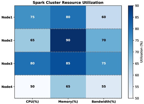 In order to analyze and optimize the workload distribution in the Spark-driven pipeline, a detailed resource utilization study was conducted across the cluster’s four main worker nodes. Each node’s utilization profile was visualized using a heatmap, highlighting CPU, memory, and network (bandwidth) usage during the main evaluation tasks. The following summary highlights key differences and roles of each node in the experiment: