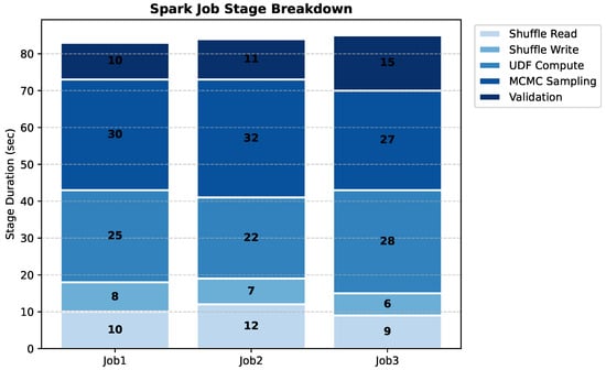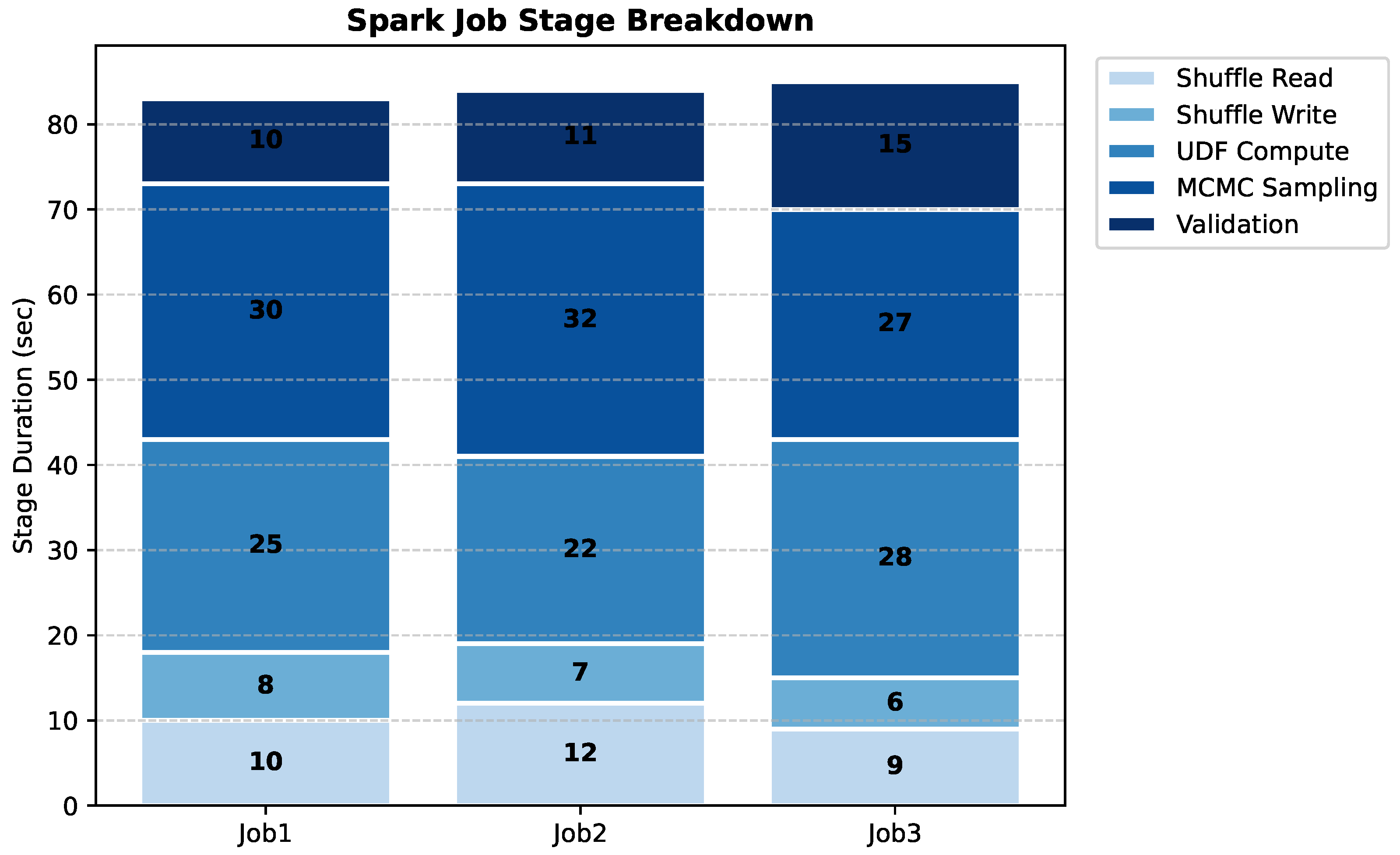 Figure 21 show that the Spark Job Stage Breakdown provides insights into time allocation for different computational stages across each workflow run. Each stage is visualized using a gradient of blue tones, with direct numeric annotation on every segment to facilitate rapid comparison. The distribution of time spent indicates that: