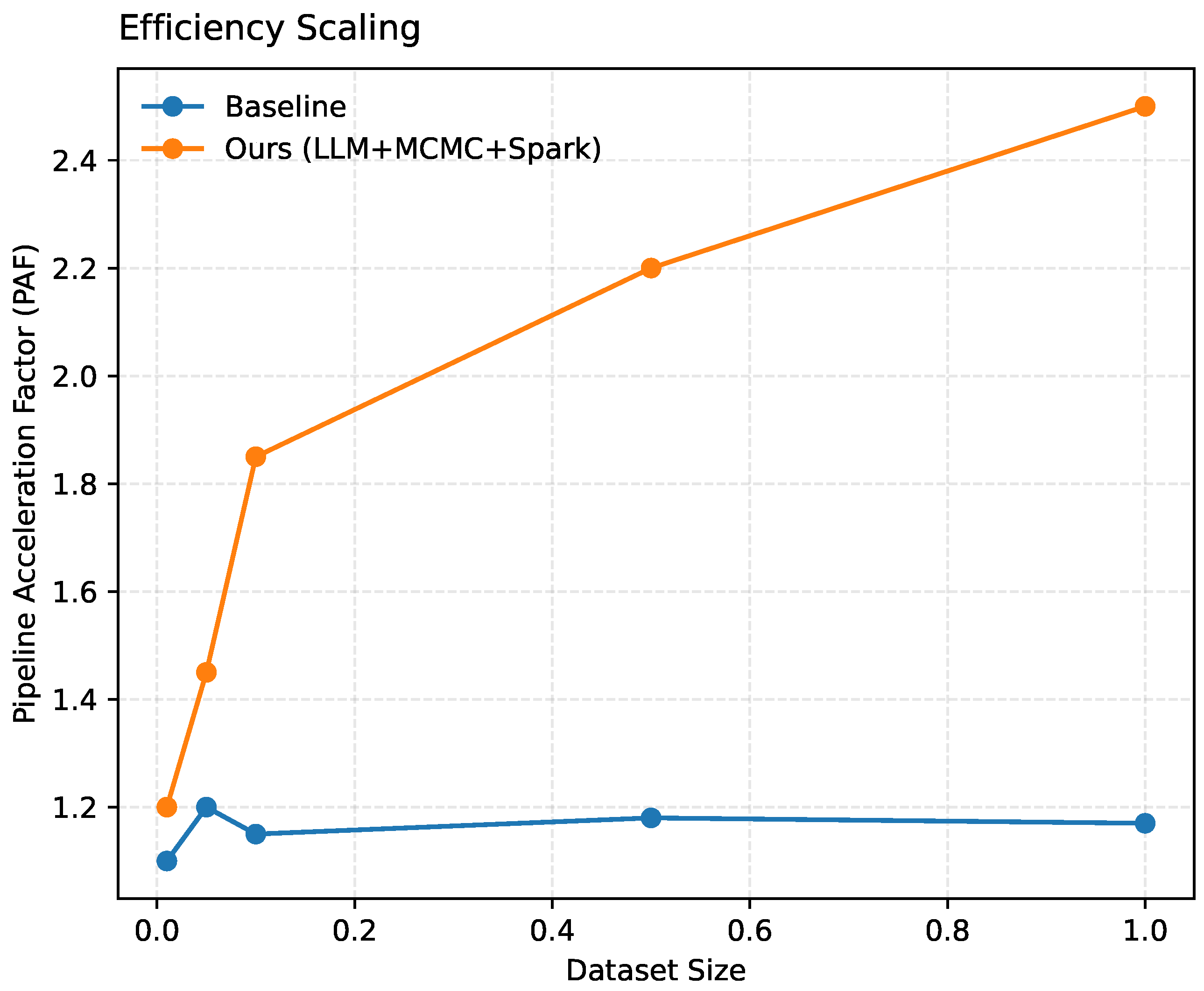This visualization highlights where optimization efforts should be focused to reduce bottlenecks and accelerate the Spark-LLM pipeline. Overall, these results suggest that combining distributed MCMC with Spark orchestration allows scalable, interpretable, and reliable inference. Mapping precision, entity resolution, and multimodal extraction remain strong across varied enterprise datasets, while diagnostics confirm convergence integrity. At the same time, these findings raise broader questions around interpretability, adaptability, and long-term sustainability across evolving technical and regulatory landscapes. The next section explores these broader implications in greater detail.