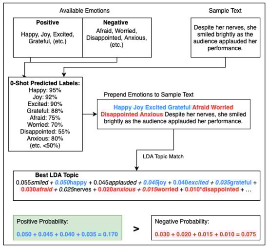 The topics formed are collections of words with assigned weights. If a document contains many of a topic’s words, they contribute to a final score indicating the probability that the document belongs to that topic. After forming topics, we assign each sample to the topic with the highest probability. We then calculate class probabilities within the topic by filtering out all non-emotion components, leaving only emotion words and their associated topic weights. We sum the positive weights and negative weights separately; whichever sum is higher determines whether the sample is considered positive or negative.