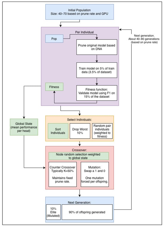Our pruning algorithm is based on the genetic algorithm design developed in our previous work on tabular models [5]. Here, we adapt the approach to prune BERT’s transformer heads instead of model nodes. While attention heads are not the largest component of the network in terms of parameter count, they are responsible for attention computations, which are operations. The genetic algorithm is largely unchanged except for the removal of node-measurement components (such as norms). See Figure 4 for an overview.