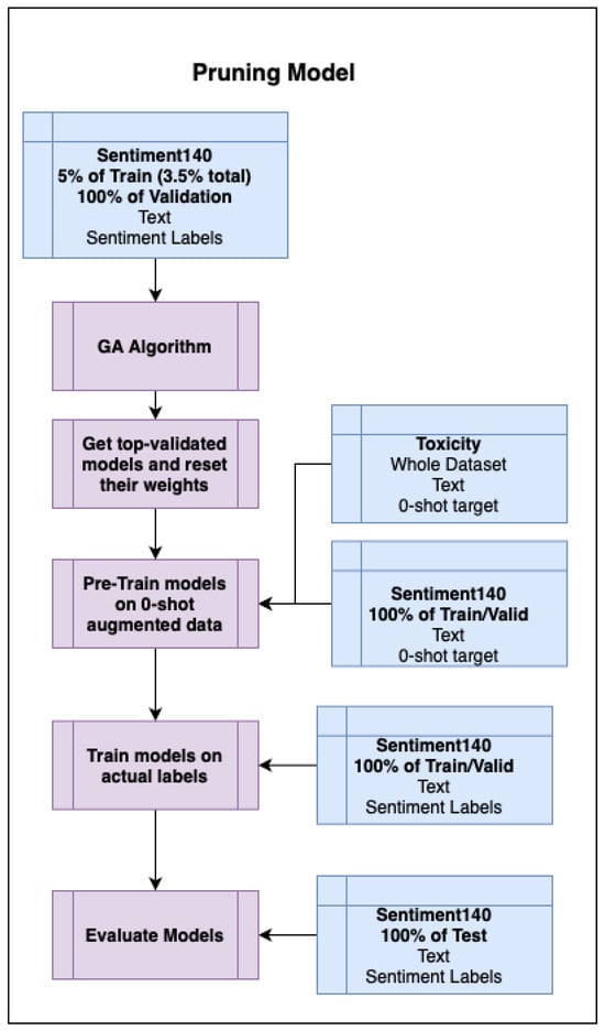 We now focus on the pruning aspect of our approach. At this stage in our methodology, we have two datasets: one labeled with actual sentiment (Sentiment140), and both labeled with 0-shot generated sentiment (Sentiment140 and toxicity). See Figure 3 for an overview of our data preparation.
