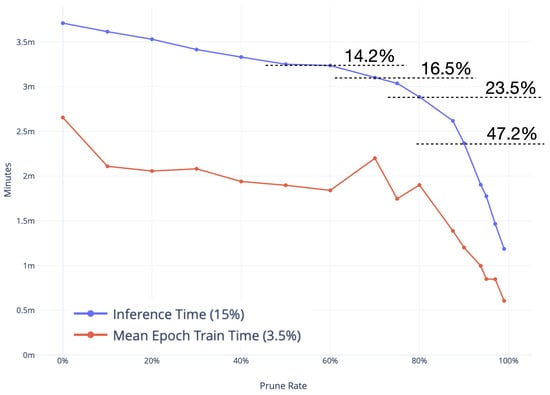 Inference and training time in minutes on the y-axis, and prune rate on the x-axis.
