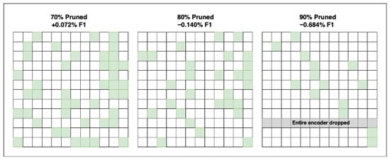 Furthermore, Parnami et al. [19] pruned “40% of the attention heads in the BERT transformer model with no loss in accuracy” (p. 1) for sentiment classification using A* search to find the best head configuration. Their search heuristic was the accuracy impact of the model when removing the current head from the current state, guiding the search by the observed accuracy drop. Behnke and Heafield [20] demonstrated that the approach works for translation, reporting that they pruned “(50–72%) in a large transformer with no significant damage to translation quality” (p. 2672), where 50% represents no significant damage. For the GLUE benchmark, Zhang et al. [21] used KL divergence to achieve a 50% head-pruning rate. Li et al. [22] also used the GLUE benchmark and achieved a 58% prune rate using a differentiable mask, followed by distillation to compress the network.
