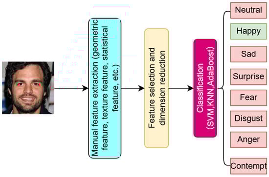 Since the 20th century, research on facial expression recognition has been widely conducted. Early on, due to limitations in computer performance and image processing technology, research on facial expression recognition focused on developing basic theory and exploring simple approaches. With the rapid development of computer technology, especially the iterative advancement of image processing, pattern recognition, machine learning (ML), and related technologies, FER research has gradually shifted from traditional methods based on prior knowledge to deep learning (DL) models. Traditional methods often use geometric features, such as the relative position and contour shape of facial organs, or texture features, such as local binary pattern (LBP) and its variants, to extract the features of expression, and then combine support vector machine (SVM) and adaptive boosting (AdaBoost) classifiers to realize expression classification [3]. With the development of deep learning, convolutional neural networks (CNNs), recurrent neural networks (RNNs), and their derived models have been widely used. CNNs’ powerful image feature extraction capabilities allow them to automatically learn multi-level features from expression images [4]; RNNs can effectively process expression sequence data and capture dynamic changes in expression over time [5]. In addition, some hybrid learning (HL) methods integrating multiple features or models have emerged in the field of deep learning technology, such as cascaded networks and multimodal models [6], aiming to fully leverage the advantages of different technologies and improve the performance of expression recognition technologies [7]. The general history of facial expression recognition is shown in Figure 1.