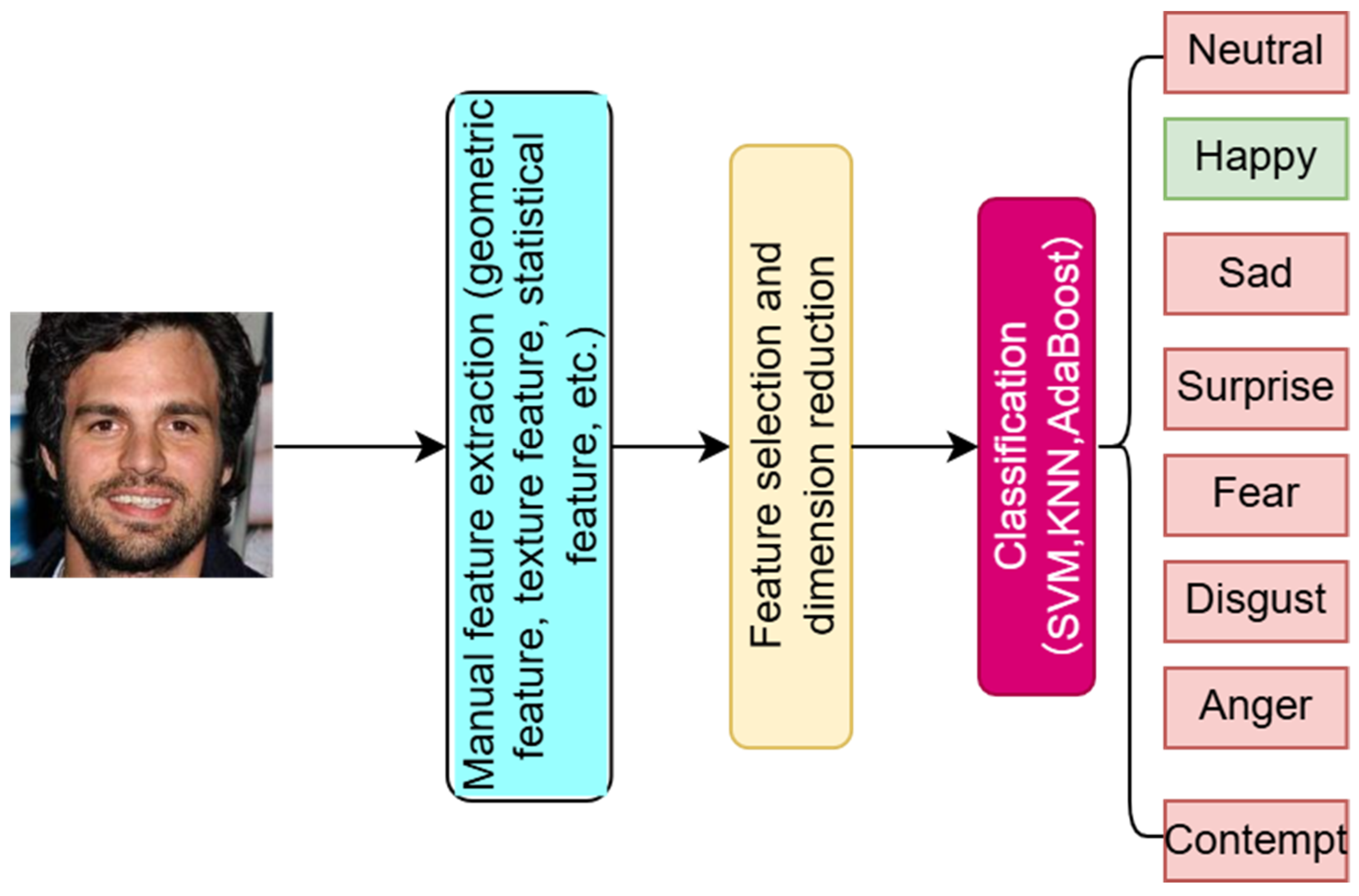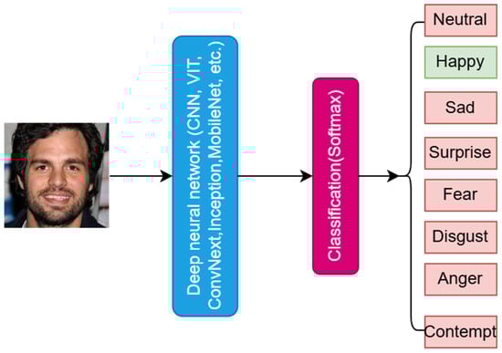 The deep learning-based method generally does not require researchers to design statistical features and directly uses the original image as input. Researchers mainly focus on the model architecture. The following are nine typical convolutional neural network models for facial expression recognition. Figure 3 shows the general process of expression recognition using a deep learning method.