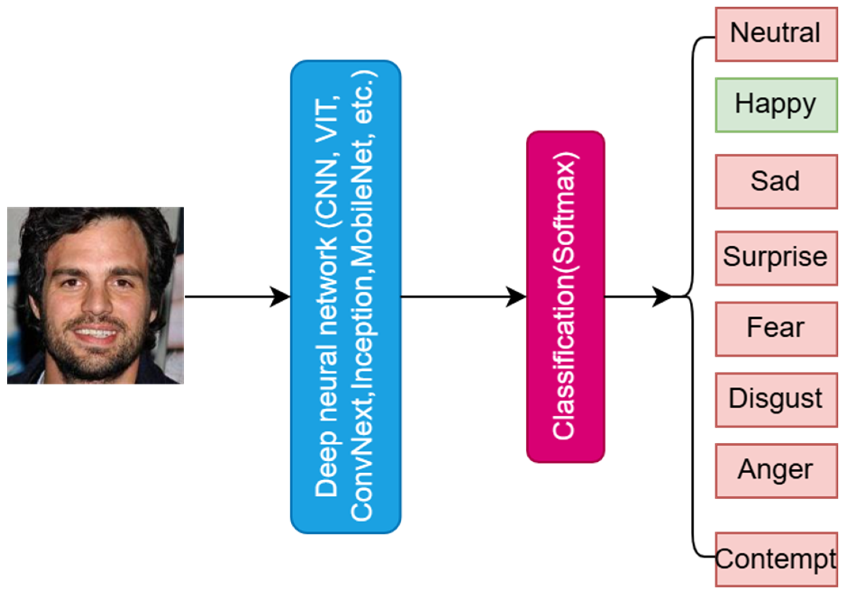 However, challenges remain in distinguishing similar negative expressions, such as anger and disgust. In 2024, Adiga et al. [43] proposed that, based on image preprocessing, a multi-layer CNN be used to automatically extract facial features, such as edges, textures, and shapes. During training, the probability of each emotion is computed using the softmax activation function, and the model is optimized with the Adam optimizer or the SGD optimizer using the cross-entropy loss function. The experimental results show that the model achieves high accuracy and generalization on the FER-2013 dataset, especially for happy, sad, surprised, and other emotions.