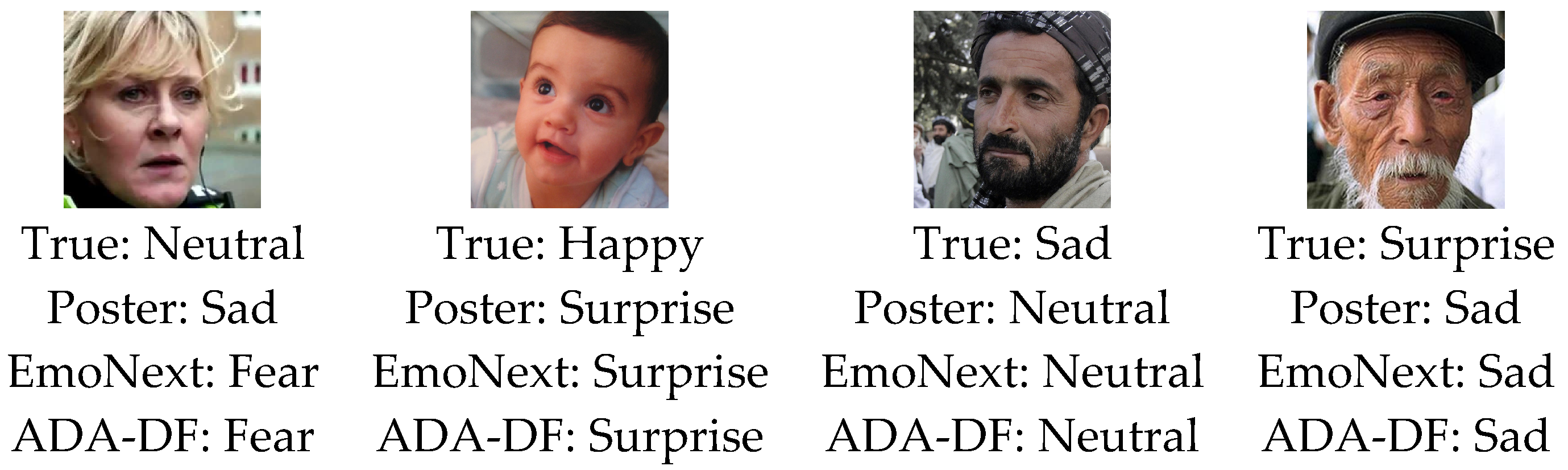 In 2025, Cao et al. [51] proposed a fuzzy perception recognition framework, COA, to address the issue of “wrong labels” and “fuzzy labels” in the sample. The COA framework introduces the emotion extraction and expression description modules. The former extracts rich semantic features from multi-scale and local attention mechanisms, respectively, via the coupled flow structure; the latter generates tag pairs by accurately predicting the probability, accurately describes the multiple emotional attributes of fuzzy samples, and better guides the model to fit mixed features during training. In the study, experiments were conducted on five datasets: RAF-DB, FERPlus, AffectNet, SFEW, and CAER-S. The results show that COA has significant advantages and robustness in dealing with a high proportion of fuzzy samples.
