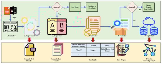 This study designs and implements a large-language-model–assisted pipeline architecture, termed KGPipeline, for constructing a domain-specific knowledge graph for electric power policies. Inspired by the workflow of a human expert team, KGPipeline adopts a “central controller + specialist modules” paradigm. It consists of one controller and five functional modules—Preprocessor, Segmentor, Extractor, Validator, and Graph-Writer—which together enable automated transformation of raw policy documents into a high-quality knowledge graph. The overall architecture is shown in Figure 2.