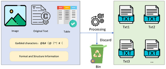 - Preprocessor Module, this module performs document format detection, text extraction, page number removal, figure/table caption filtering, and corrupted-line cleaning. The output is a normalized UTF-8 plain text file suitable for further processing. Figure 5 shows a before-and-after comparison of preprocessing.