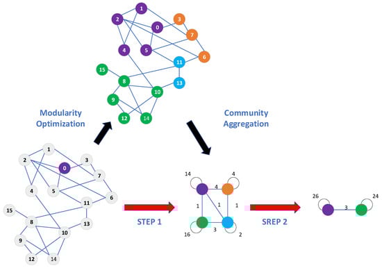Frequency-based prior weights wf alone cannot capture the semantic and structural role of an entity within the knowledge graph. To enhance disambiguation accuracy, we integrate graph-structural information by applying the Louvain community detection algorithm to the domain knowledge graph. Louvain is selected due to its advantages—no need to predefine the number of clusters, capability to handle large graphs, and high computational efficiency. A schematic of the Louvain algorithm is shown in Figure 6.