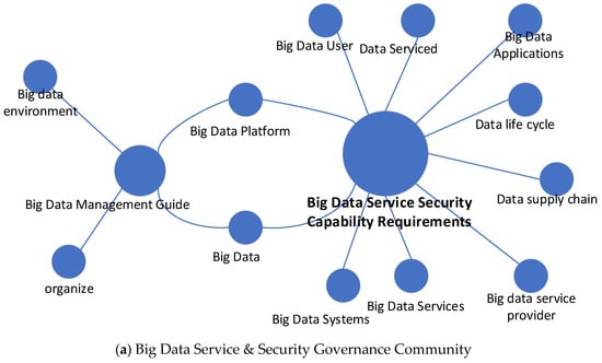 The community structure revealed by the Louvain algorithm provides meaningful insights into the semantic organization of the knowledge graph. As shown in Figure 7a, the large-scale big-data knowledge graph is clustered into two major communities. The first community is centered around “Big Data Services Requirements”, bringing together nodes such as “Data Supply Chain,” “Big Data Users,” and “Big Data Applications,” which collectively reflect the domain’s emphasis on service demands and application-driven requirements. The second community is organized around “Big Data Security Requirement Guide,” connecting nodes such as “Big Data Environment” and “Organize,” highlighting themes related to security standards and environmental constraints in big-data systems. Notably, “Big Data Platform” lies at the intersection of these two communities, indicating its bridging role between service-oriented requirements and security governance. This community structure reveals two primary thematic directions in big-data research and their inherent connections, providing structural support for downstream semantic parsing and knowledge-base construction.