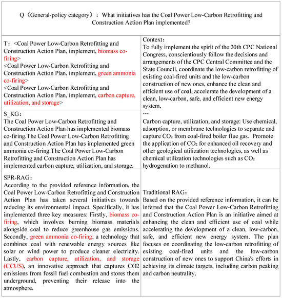 To objectively evaluate the performance of SPR-RAG in electricity-policy question answering, we compare it with four baseline systems: GraphRAG, LightRAG, Traditional-RAG, and Naive-KG-RAG. Traditional-RAG adopts standard vector-based text retrieval. Naive-KG-RAG augments Traditional-RAG by converting all triples into natural-language sentences and performing vector retrieval over these textualized triples. GraphRAG and LightRAG rely on LLM-generated graph structures for retrieval. The experimental results are presented in Table 7, and Figure 8 demonstrates a qualitative comparison between SPR-RAG and Traditional-RAG.