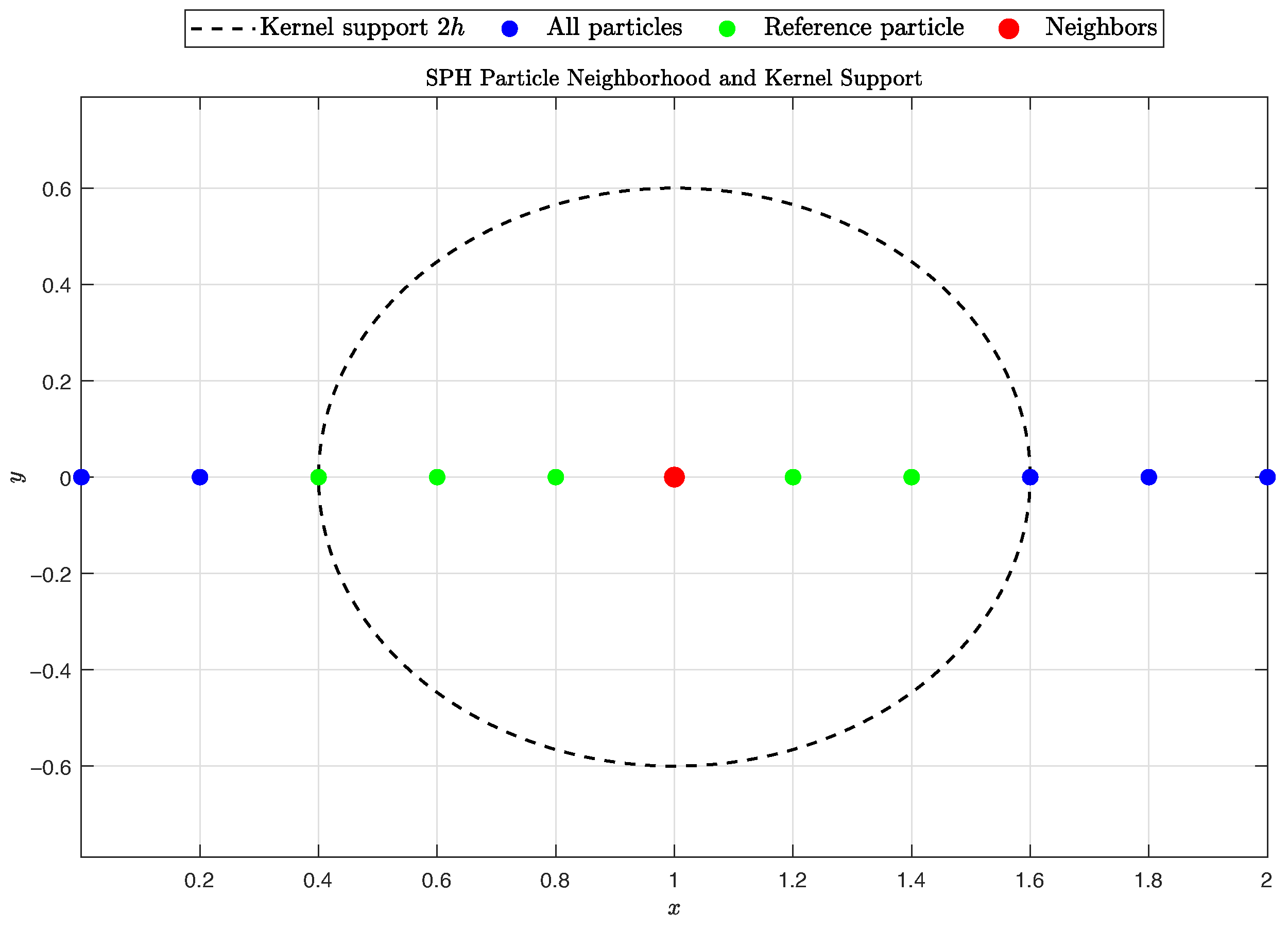 16]. Particles interact with their neighbors through a smoothing kernel, which provides a weighted approximation of field quantities and their derivatives. Only particles within the kernel’s compact support contribute to the local approximation. Unlike traditional grid-based methods, SPH does not require a fixed mesh and relies entirely on these interpolation kernels to evaluate the field variables and their derivatives.