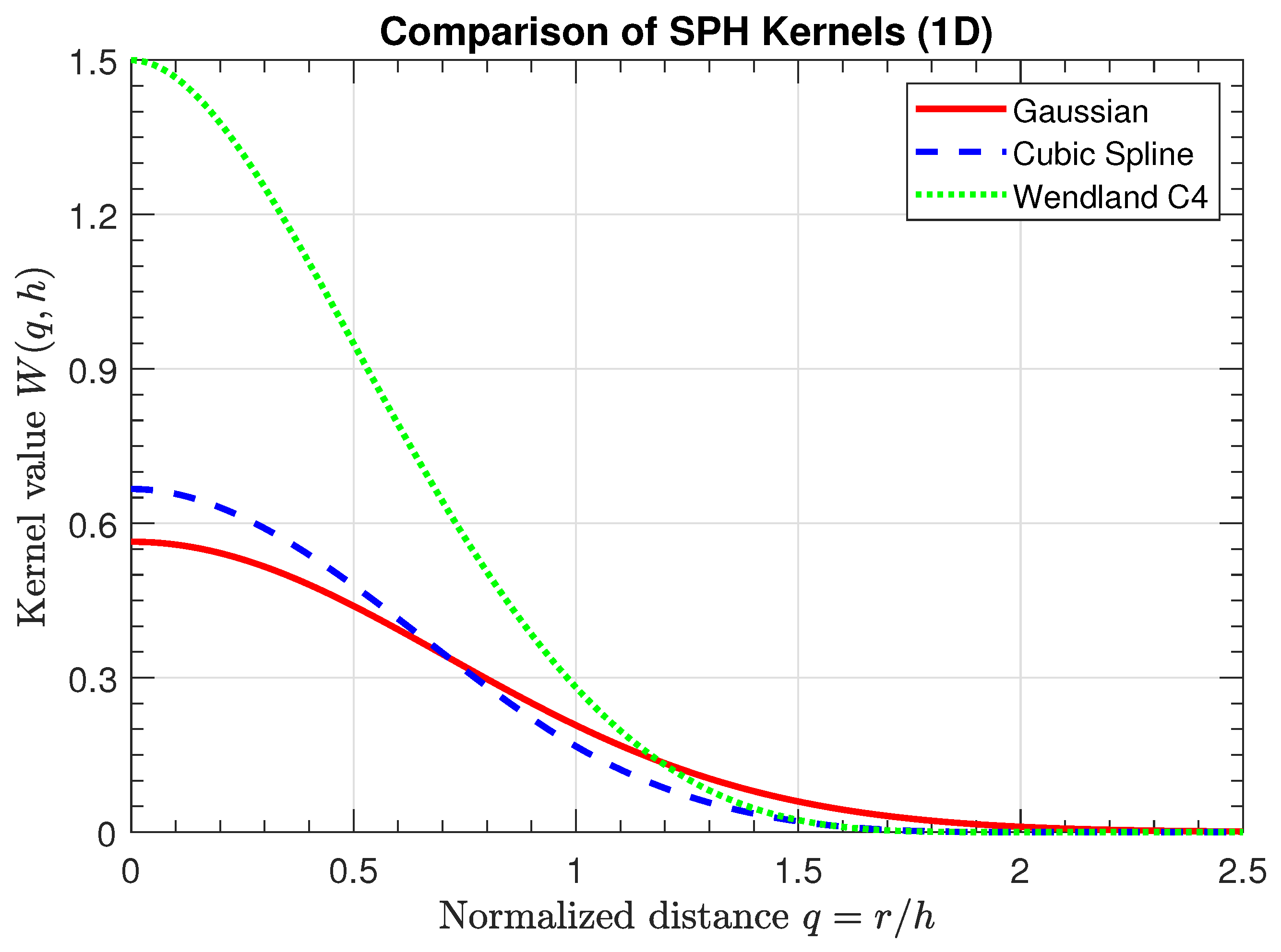 The kernel function plays a central role in determining the accuracy, stability, and convergence of SPH approximations. Various kernel functions have been proposed, and in this subsection, we focus on the most commonly adopted formulations.