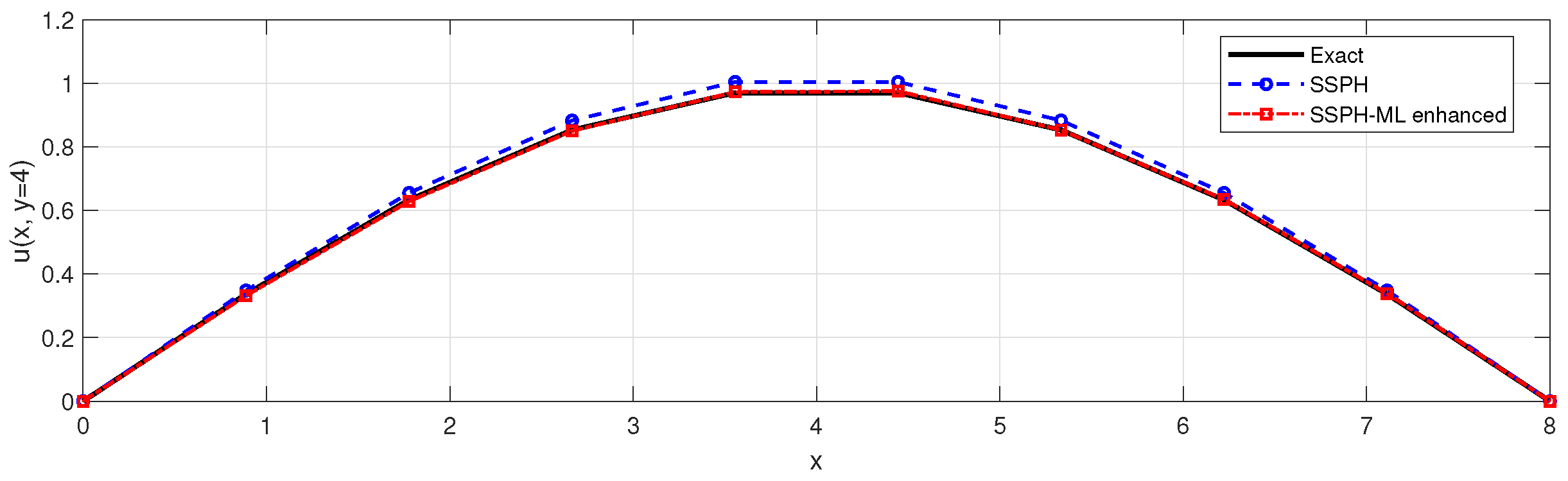 cross-sectional plot along the domain midline, comparing the exact, SSPH, and SSPH-ML enhanced solutions.