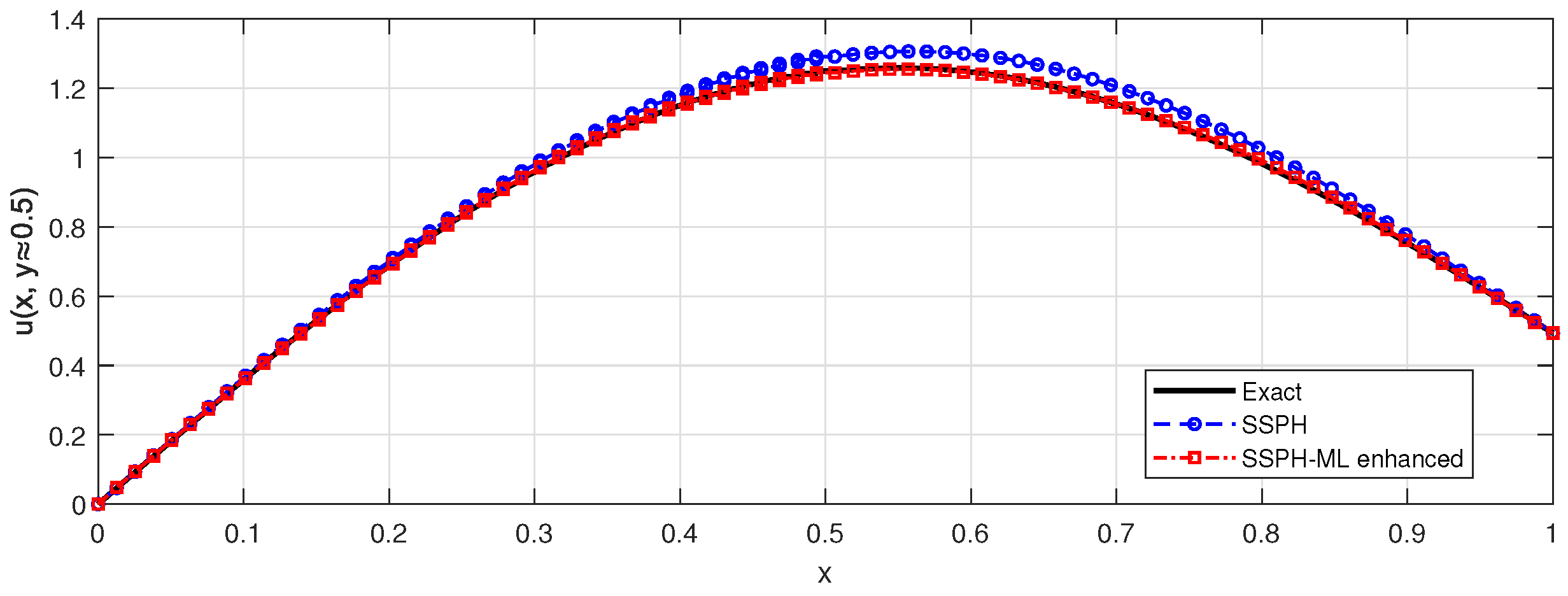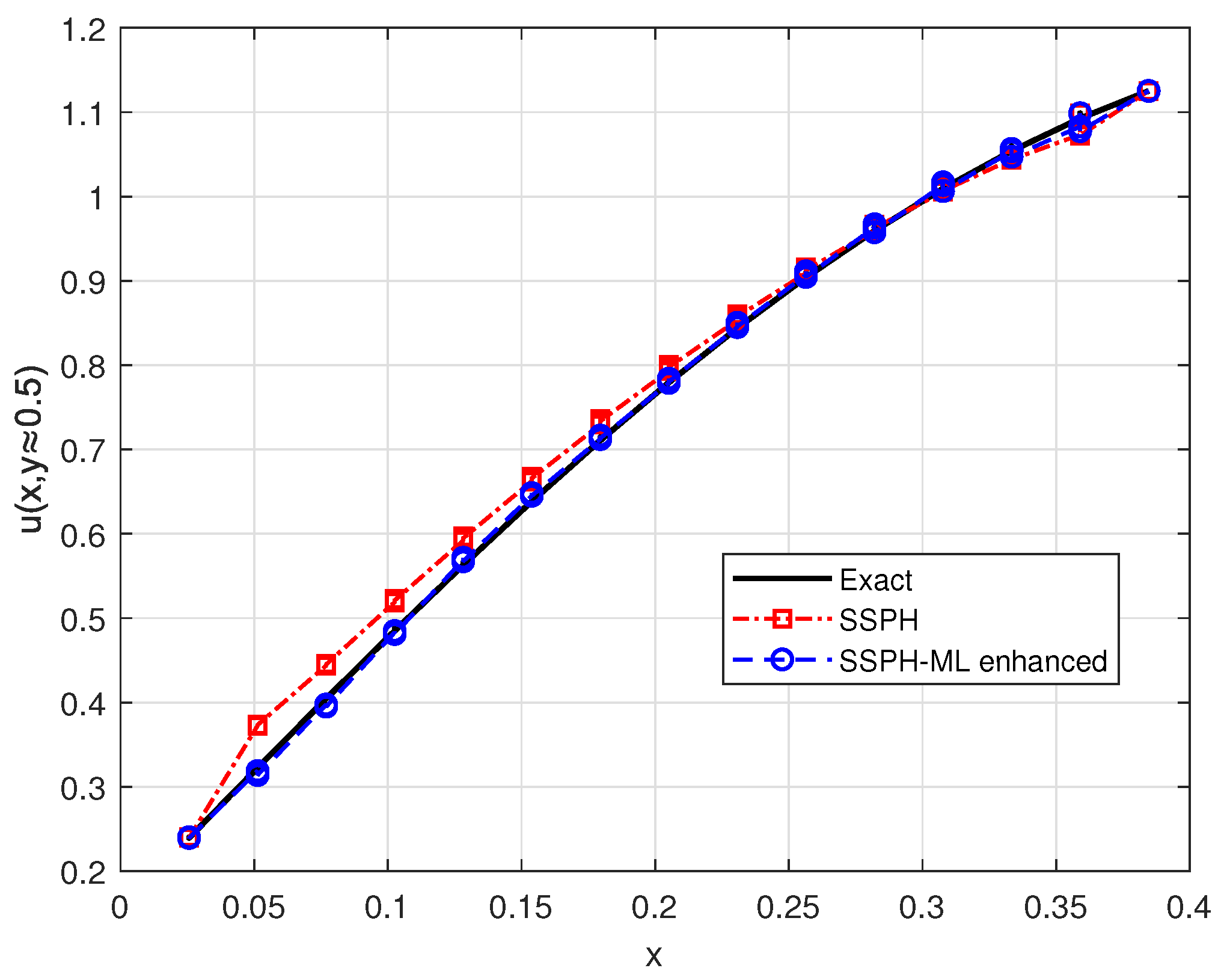 Figure 12 shows the numerical solution obtained using the classical SSPH method and the proposed SSPH enhanced with ML-based residual correction using