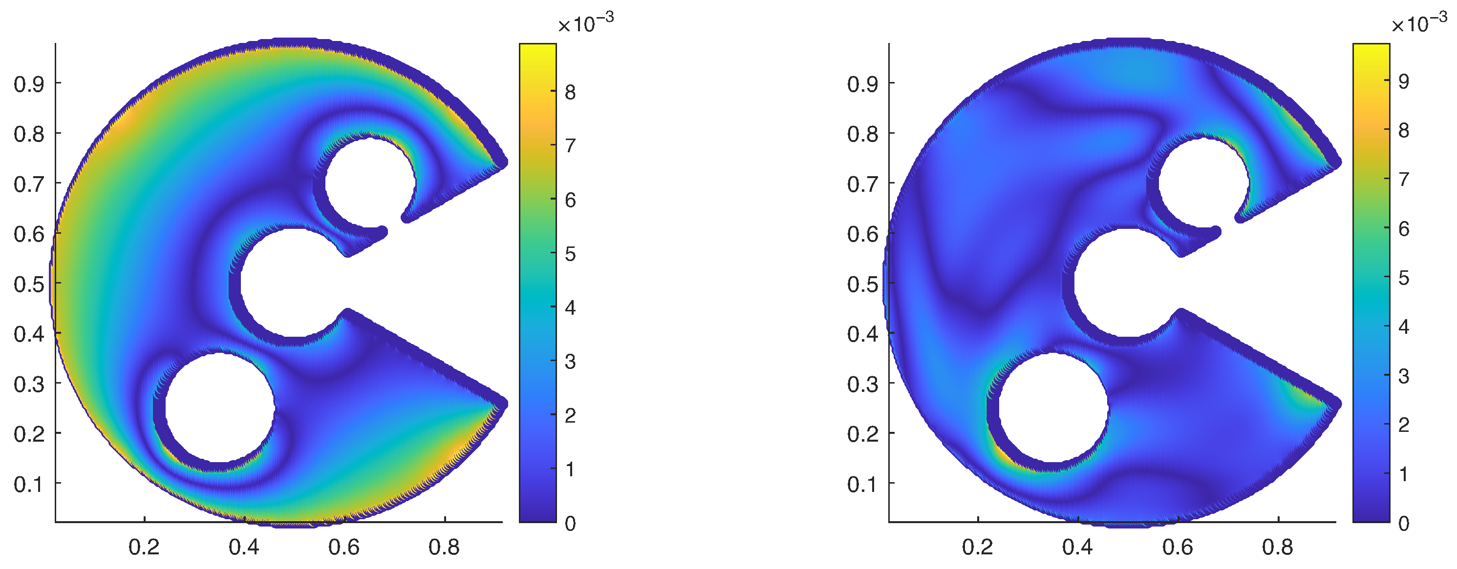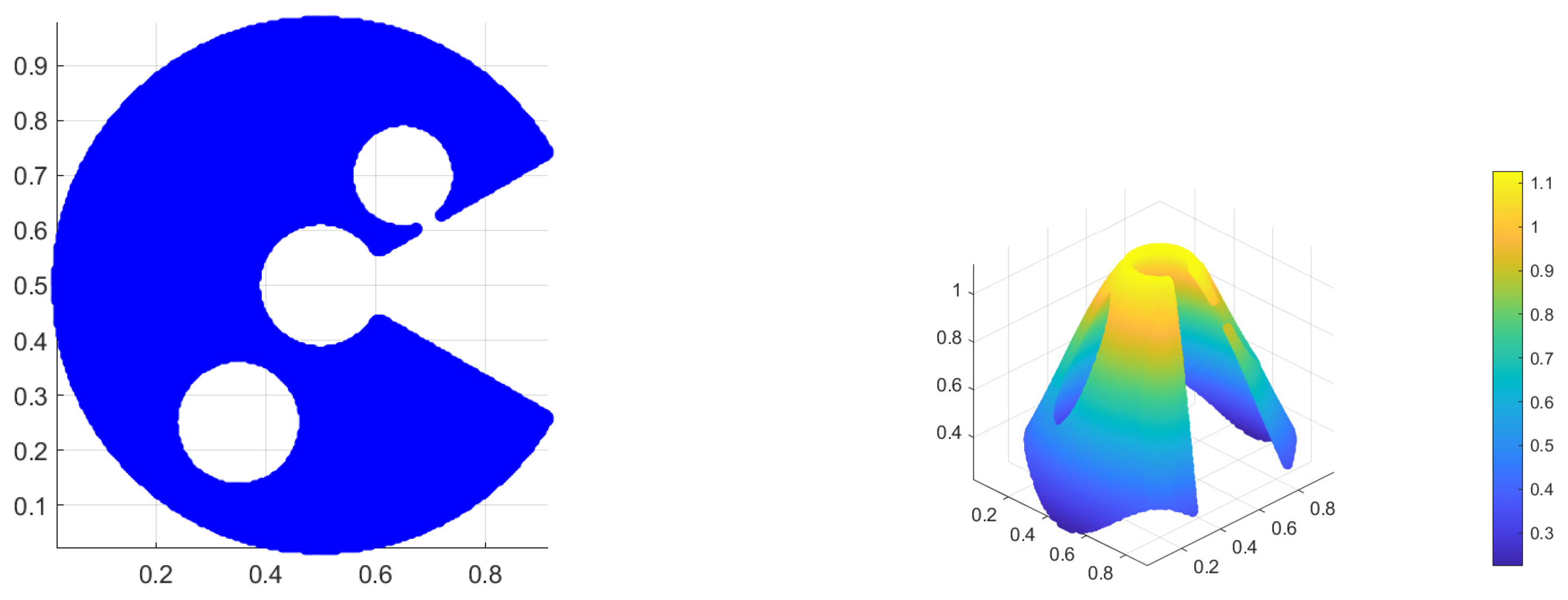 In this example, we consider a highly nontrivial curved domain to assess the robustness of the SSPH method under severe geometric distortion. The computational domain is a crescent-shaped annular region centered at , with an inner radius , an outer radius , and an angular extent . Two circular interior holes are removed from the domain: one with radius centered at and another with radius centered at . This geometry introduces curved outer boundaries, concave regions, and multiply-connected topology, all of which are known to challenge meshfree Laplacian operators.