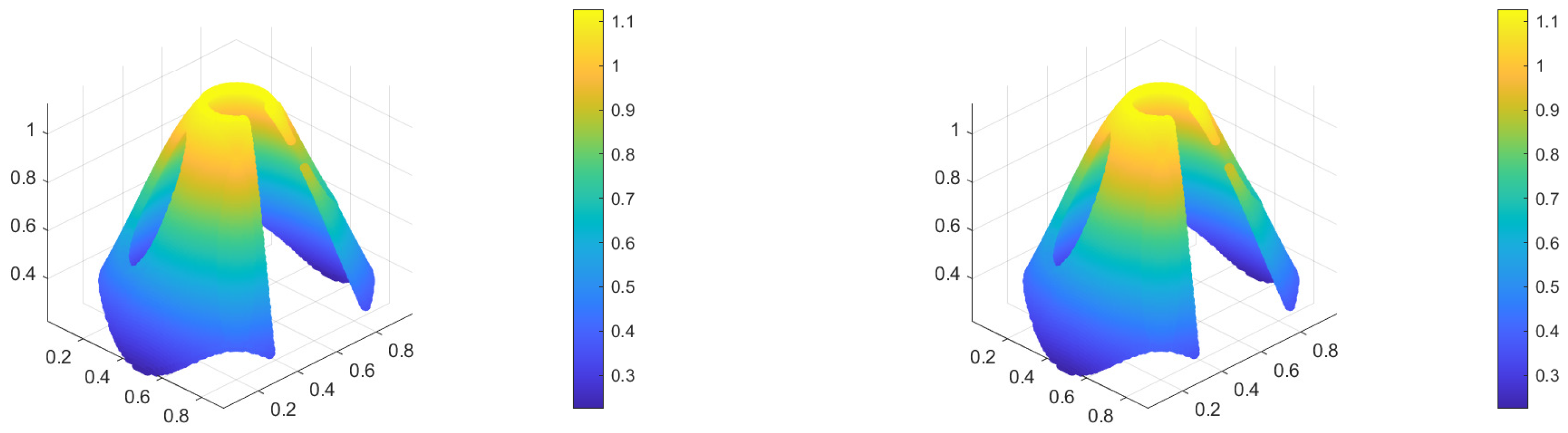 The results of this example demonstrate that the proposed method performs robustly on a highly irregular curved domain containing multiple holes and geometric discontinuities. The proposed correction consistently reduces the numerical error compared to the standard SSPH formulation, with the most pronounced improvements observed in regions where the nonlinear term and geometric complexity induce larger local inaccuracies. These findings confirm the effectiveness and stability of the ML-based residual correction when applied to challenging nonlinear elliptic problems on complex geometries.