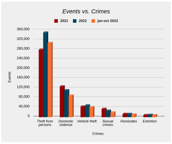 One of the critical factors in improving citizens’ quality of life is crime prevention. Urban regions with high population density are often associated with elevated crime rates, making it increasingly challenging to ensure public safety. According to the Organization for Economic Cooperation and Development (OECD), public safety is a fundamental element of citizens’ well-being, making it a priority for public administrations across the globe [6]. Furthermore, crime statistics reported by SIEDCO (Sistema de Información Estadístico, Delincuencial Contravencional y Operativo de la Policía Nacional—National Police Statistical, Criminal, Contravening, and Operational System) [7] indicate that the most common crimes in Colombia include the following: