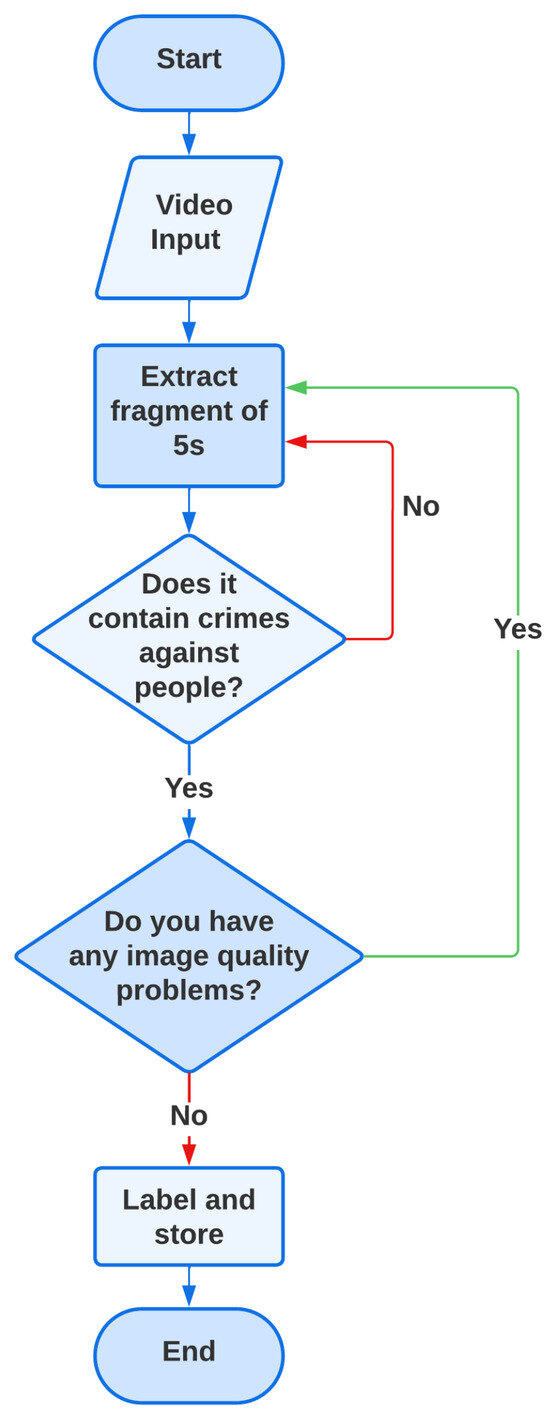 The proposed dataset is specifically focused on incidents involving crimes against individuals, such as robberies, assaults, fights, and abuse, as illustrated in Figure 3. Videos depicting property damage or those with low quality or focus issues were excluded. Each sample is meticulously labeled to contribute effectively to the supervised training of models, ensuring that the input data are consistent and accurately represent the incidents of interest. Figure 4 presents a flowchart illustrating the methodology applied.
