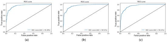 ROC-AUC curves for CrimeDetection in Experiments 7 (a), 8 (b), and 9 (c).