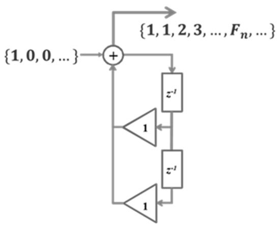 As can be readily demonstrated, the Fibonacci sequence can also be interpreted as the impulse response of a second-order IIR filter with unitary recursive weights, as depicted in