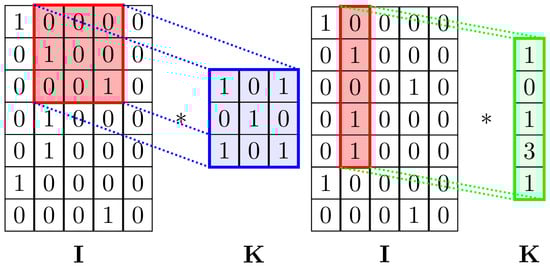 Comparison of convolution with convolution. I represents the input of the convolution, while K is the filter. The symbol * denotes the convolution operator. In each I matrix, the red region highlights the current area where the filter K (shown in blue or green) is applied.