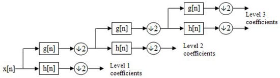 The outputs of these filters are downsampled by a factor of 2 to reduce the number of coefficients, effectively halving the time resolution. The signal decomposition can be expressed as follows: