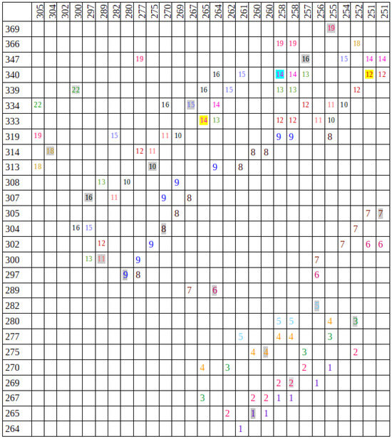Let us take a closer look on what might cause a long branch. The most notorious instance was , , requiring s, almost half of the total runtime. The branching phase made a total of 3,655,375 steps, where a step can be the addition of a triplet, the exclusion of a triplet from further additions, or a branching step containing the binary decision of applying or excluding the same triplet. There were 66,975 branching steps which were eventually backtracked. If we take a look at how the solution was constructed, it only contains four unsuccessful branches, consecutively after each other. After 144 triplets already in the collection, there were four trials that involved adding triplets , , , and , but none of them worked. Afterwards, the construction continued by adding . It seems that according to the heuristic rule for selecting the next branch, only the fifth option for using up item 312 turned out to be feasible. The first four unsuccessful attempts consumed 806,382, 1,122,151, 1,990,333, and 1,623,949 steps, respectively, so each wrong decision was quite significant.