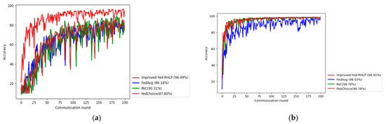 To demonstrate the resilience of the improved Federated RHLP algorithm, we constructed Non-IID challenges to assess the algorithm’s robustness at two distinct levels: (1) High Non-IID Challenge: Each client was assigned 1–2 classes for local model updates, and (2) Low Non-IID Challenge: Each client was assigned 5–6 classes for local model updates. The datasets were distributed among 100 clients, with each client receiving a varying proportion of data samples, ranging from 10% to 30%, to support the training of their local models.