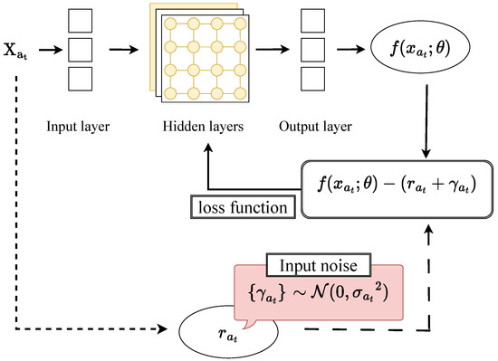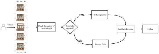 Bandit with Noisy Data: In the realm of multi-armed bandit problems, managing noise is equally critical. Here, noise is not only seen as a challenge but also as a means to enhance the algorithms’ exploratory capabilities. This exploration mechanism involves integrating noise into the decision-making process, thus promoting learning and adaptation in uncertain environments [23]. Ref. [23] were the first to explore context-free multi-armed bandits using noise-perturbed observations to estimate arm rewards and select the arm with the highest estimated reward. The advantage of their approach lies in its minimal modifications, thereby reducing computational complexity. Refs. [24,25,26,27] proposed two main strategies to induce exploration through perturbation. The first strategy involves adding a fixed number of copies for each observation and replacing the rewards with randomly selected values. This method promotes exploration by increasing the data volume and diversifying the reward structure. The second strategy perturbs the observed rewards without expanding the data volume. Ref. [5] combined this strategy with deep neural networks by injecting noise into the observed reward history and training the models using these noisy rewards.