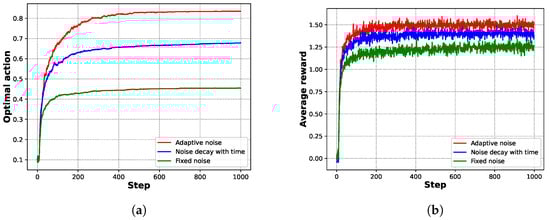 This paper presents an adaptive noise detection mechanism that adjusts the noise level dynamically based on arm selection frequency. In this framework, the noise intensity decreases logarithmically as the number of rounds increases. The logarithmic decay is characterized by slow attenuation, enabling prolonged high levels of exploration. This helps reduce the risk of premature convergence to suboptimal solutions, which is especially important in complex or high-dimensional environments. To validate the framework’s effectiveness, we conducted a small experiment using a simple synthetic dataset, comparing three noise strategies: fixed, decreasing, and adaptive noise. The average rewards for each arm were as follows: [0.2, −0.85, 1.55, 0.3, 1.2, −1.5, −0.2, −1.0, 0.9, −0.6]. As shown in Figure 4a, the logarithmic adaptive noise strategy outperforms the other two strategies in terms of the proportion of optimal actions, suggesting that dynamically adjusting the noise more effectively aids in selecting high-reward arms. Furthermore, Figure 4b shows that the logarithmic adaptive noise strategy also performs well in terms of average reward [30,31].