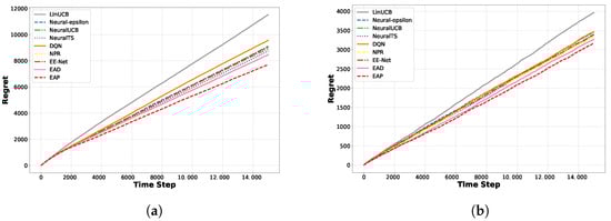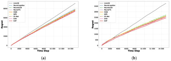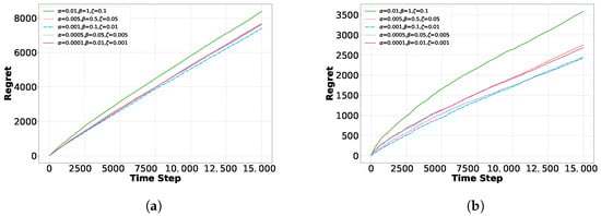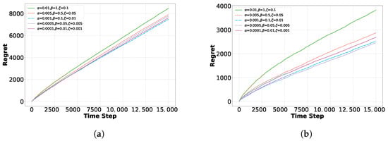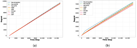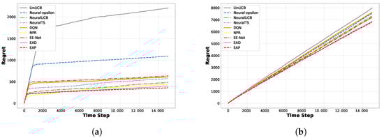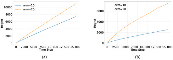 Dataset Introduction: The Yelp dataset, released by Yelp as part of a data challenge, includes 4.7 million ratings from 1.18 million users for 157,000 restaurants [34]. The MovieLens dataset, on the other hand, contains approximately 25 million ratings from about 160,000 users for approximately 60,000 movies [35]. In these datasets, restaurants and movies are considered arms. We selected the 2000 most active users and the top 10,000 highest-rated arms. SVD was then used to extract 10-dimensional feature vectors for each user and arm from the rating data. In this study, the algorithm aims to select arms with lower ratings. Specifically, the algorithm’s rewards are based on the star ratings users give to arms. In each round, 10 arms are set up with 1 arm randomly selected for a reward of 1 and the remaining 9 arms selected to have a reward of 0. The context for each arm is the concatenation of the corresponding user’s feature vector and the arm’s feature vector.