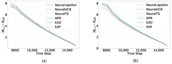 As depicted in Figure 9, the experimental results demonstrated that noise-based exploration strategies outperformed confidence interval-based strategies. In the dynamic environment, both the EAD and EAP algorithms could adaptively adjust noise variance based on the frequency of arm selections, thereby enhancing exploration capabilities and facilitating quicker adaptation to changes in user preferences. This study underscores the significant advantage of our proposed adaptive noise mechanisms in dynamic environments, particularly in coping with frequent changes in user preferences.