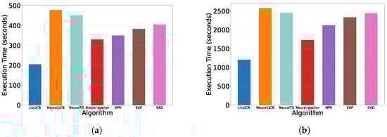 Effect of the number of candidate arm sets on exploration time. (a,b) Comparison of exploration times between the EAD and EAP algorithms and the NeuralUCB algorithm with arm numbers of 10, 20, 50, and 100: (a) Yelp. (b) Movielens.