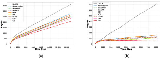 Neural contextal bandit: To learn nonlinear reward functions [18,19], deep neural networks have been adapted to bandit problems through various modifications [20]. For instance, NeuralUCB employs random feature mappings from deep neural networks to establish upper confidence bounds for exploration [13], while NeuralTS uses a comparable approach to derive samples from posterior distributions [14]. Additionally, BatchNeuralUCB explored the effectiveness of batch learning, which calculates rewards under both fixed and adaptive batch size conditions [21]. To address the high computational demands, Neural-LinUCB implements UCB-based exploration in the neural network’s final layer, significantly reducing the computational load associated with gradient-based UCB [17]. EE-Net constructs a neural network similar to NeuralUCB to estimate expected rewards for each arm and creates an exploration network that predicts potential rewards for each arm based on current evaluations [22].