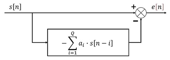 Here, is the time series of the digital signal, is the prediction order, and are the linear prediction coefficients. Thus, prediction of the sample at any moment is computed as a linear combination of the previous samples of the signal, and hence, the prediction is linear. The LPC model is thus an autoregressive model [35].
