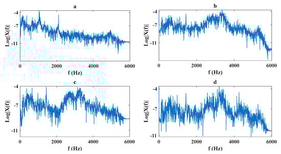 Spectrum of different signals; (a): (healthy case); (b): (fault type: inner, fault diameter: 0.007″); (c) (fault type: inner, fault diameter: 0.014″); (d) (fault type: inner, fault diameter: 0.021″).
