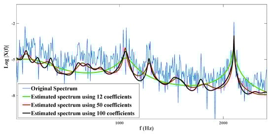 The number of coefficients should correspond to the number of formants in the signal. Figure 3 shows the estimated spectrum of a healthy signal with zero loads on the bearing from the CWRU dataset using 12, 50, and 100 LPC coefficients. Using only 12 coefficients was not sufficient to obtain an accurate estimate, while using 100 coefficients did not significantly improve the estimate using 50 parameters. Therefore, using 50 parameters was suitable for achieving a smooth estimate.
