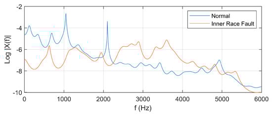 Figure 4 shows the LPC spectrum for normal and defective signals from Figure 2a,b, with the number of LPC coefficients equal to 50. It can be seen that the compressed spectrum captures the main behavior in the original spectrum and, in addition, the spectra of signals of different types are significantly different.