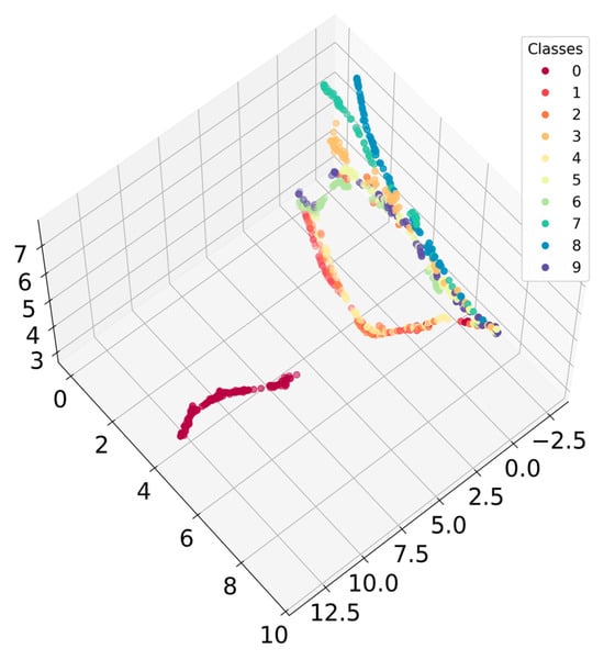 We applied UMAP dimension reduction [42] to visualize the 50-dimensional LPC features in a 3D space for all signal types in the CWRU dataset with zero load. Different colors in Figure 8 represent different conditions. More information about these conditions can be found in Section 3.1. The results suggest that the features chosen are effective in classifying the fault types, as the points are not randomly located, but exhibit a certain order. The Normal class “0” is well separated from the other defective classes.