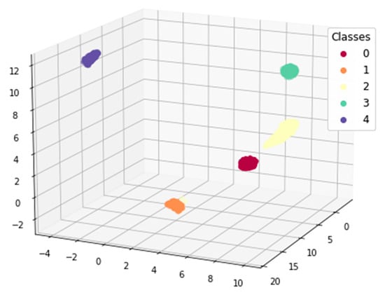 Figure 9 shows a similar arrangement of points in the SUSU dataset after dimensionality reduction using UMAP. This dataset contains five signal classes and is described in more detail in Section 3.2. Again, we observe that the data form distinct clusters corresponding to different types of signals.
