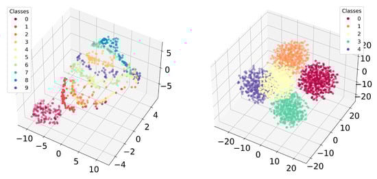 We also used the t-SNE dimensionality reduction method [43], and similar results obtained with it are presented in Figure 10. It can be seen that this method, when reducing dimensionality, splits the data into clear, separated clusters: 10 for CWRU dataset and 5 for SUSU dataset. In general, the t-SNE method confirms the results obtained by UMAP and also indicates the informativeness of the LPC coefficients and the possibility of successfully solving the classification problem.