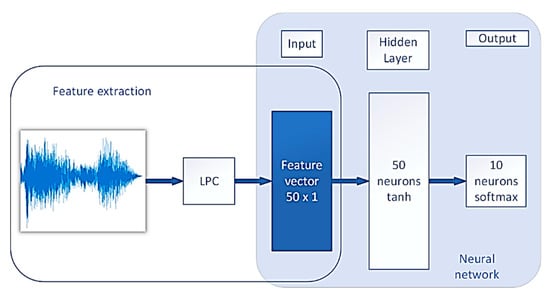 At the first stage, LPC coefficients are extracted from the signals using the LPC algorithm described in Section 2.1. These coefficients are features that are then fed to the input of the neural network. To increase the sample size of the training dataset, the signal is divided into short overlapping time frames (see Section 3.1). The set of 50 LPC coefficients calculated for each frame provides the training dataset for the classifying NN.