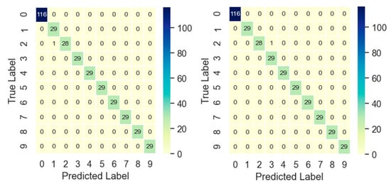 For each of the five classes in SUSU dataset, 70% of the available data were used for model training and validation; the remaining 30% were used for testing. A similar experiment on this dataset was carried out by Sinitsin et al. in [33], where they used the same dataset. However, ref. [33] used a hybrid model with mixed inputs. The linear acceleration signals were turned into time–frequency images using a Hilbert–Huang transform, which were the inputs for the CNN. The magnitude of the components of the frequency spectrum around the first and the second torsional natural frequencies of the shaft were summed to find the numbers N1 and N2 from the corresponding angular signals segments, which were inputs for the Multi-Layer Perceptron branch.