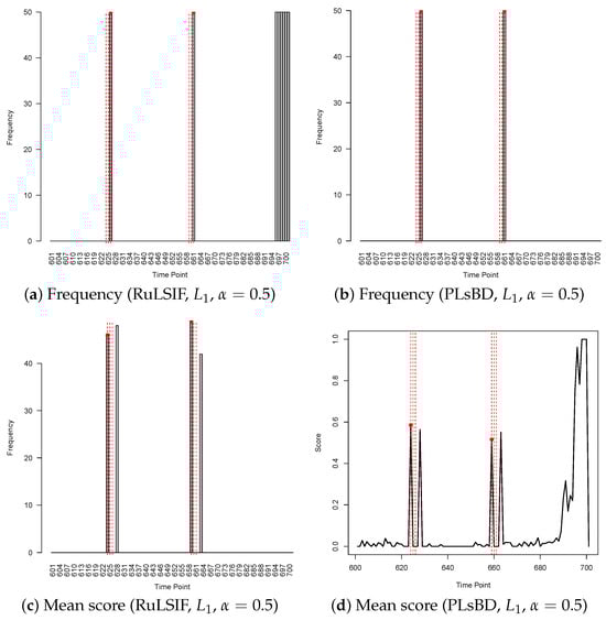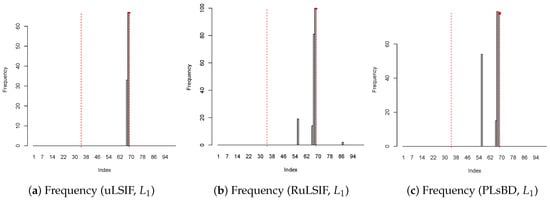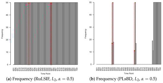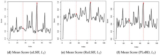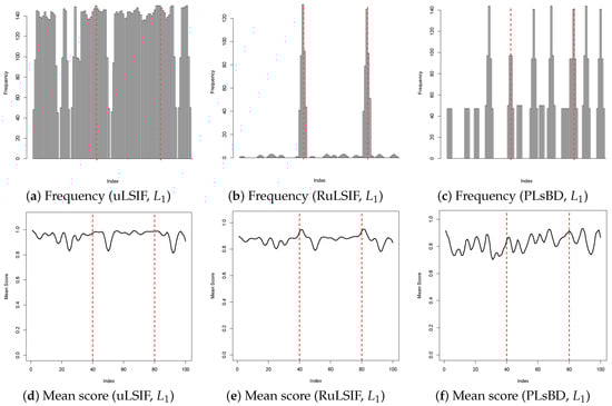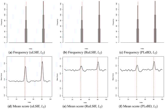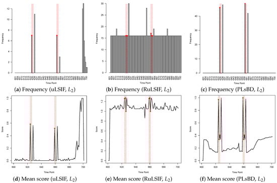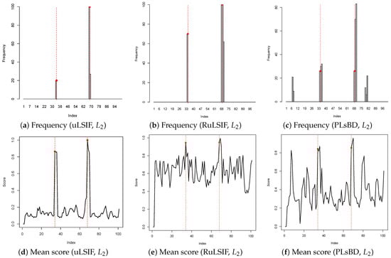 Figure 4 illustrates the frequency of anomaly candidates and their mean dissimilarity scores across 100 repeated runs using the uLSIF (a, d), RuLSIF (b, e), and PLsBD (c, f) measures, with parameters learned via the loss function. Figure 4a,d reveals that the uLSIF method exhibits the weakest performance in anomaly detection. Numerous data points are incorrectly identified as anomalies in the frequency plot, while the mean dissimilarity score remains flat and fails to provide meaningful insights. In contrast, the introduction of a small mixing parameter in RuLSIF significantly enhances its performance. While PLsBD also identifies the two true anomalies, RuLSIF outperforms PLsBD by producing fewer false positives. This is evident in Figure 4b,e, where RuLSIF displays two distinct peaks in the mean score plot, accurately corresponding to the true anomalies at indices 40 and 80.